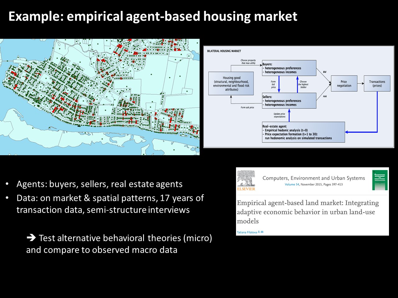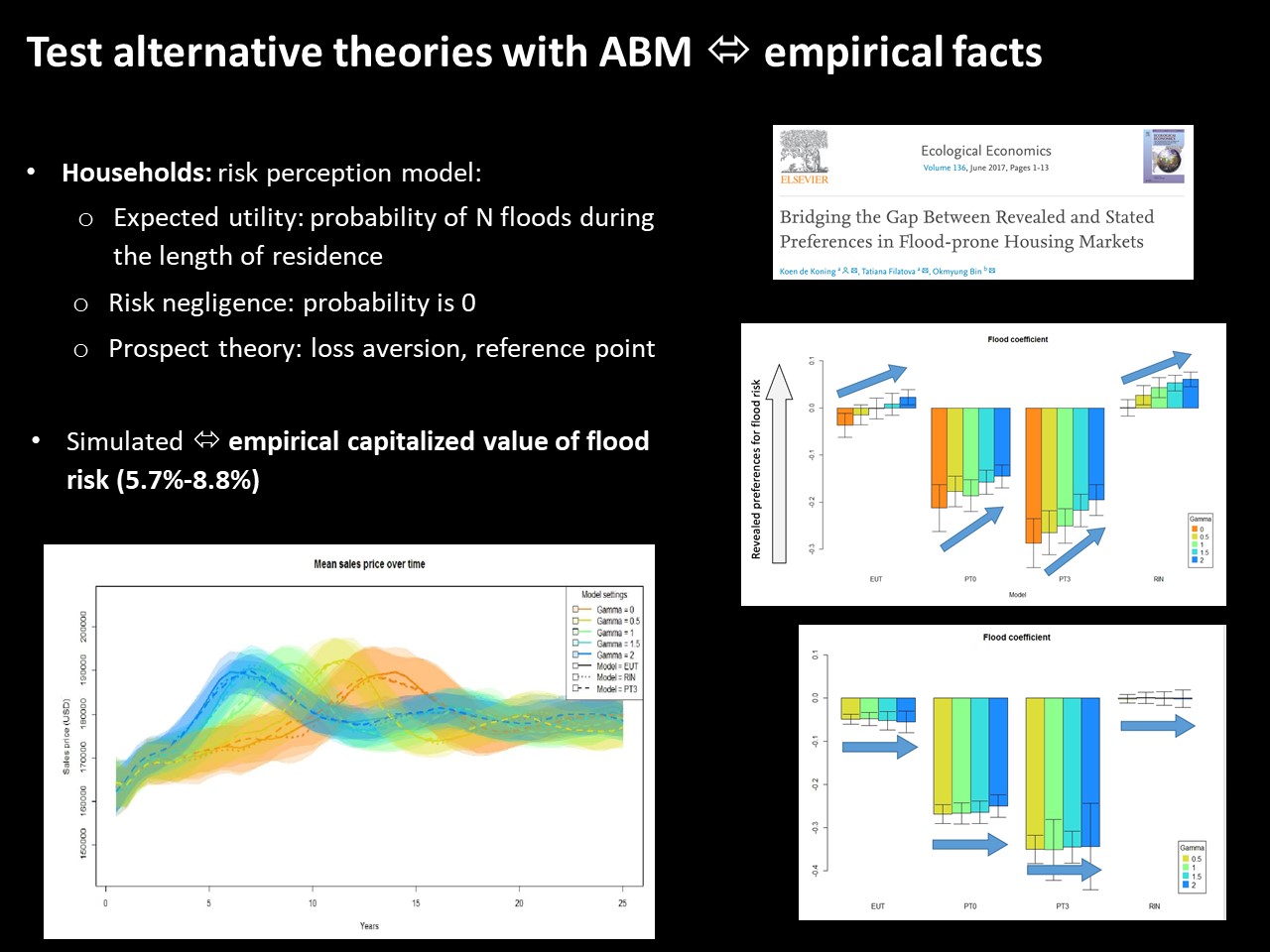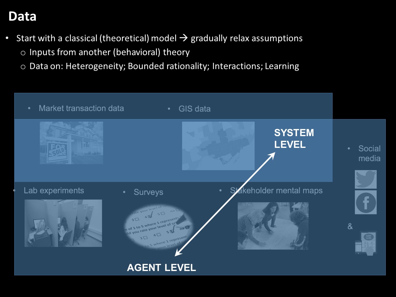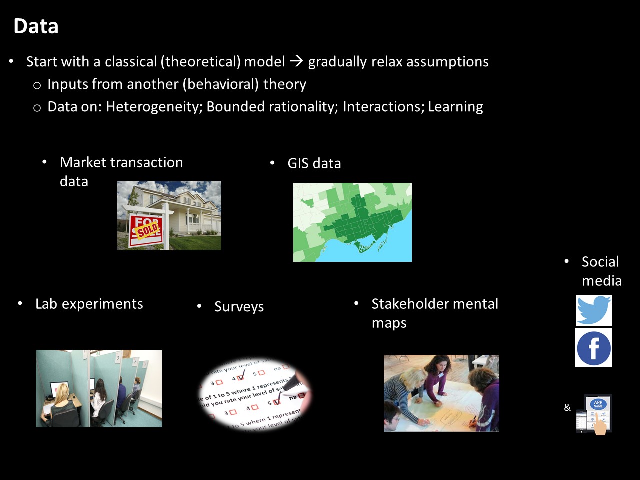 So what is the formal procedure we use to develop our Agent Based Models? We first start from the theory to isolate the cause-effect relationships and to formulate hypotheses. We then collect a set of very different data, ranging from market transactions to GIS, Lab experiments and surveys to test alternative behavioral theories and compare to observed macro data.