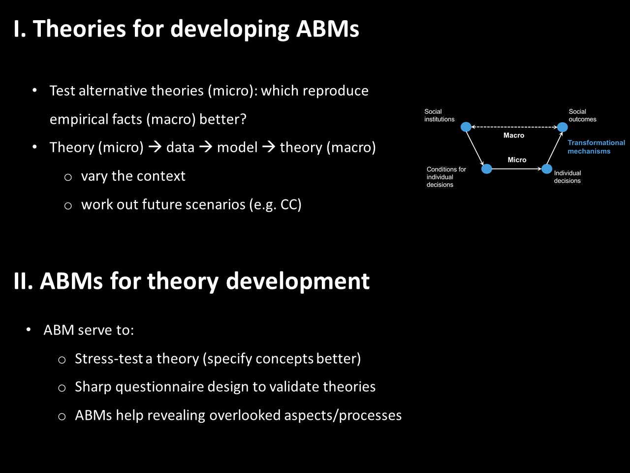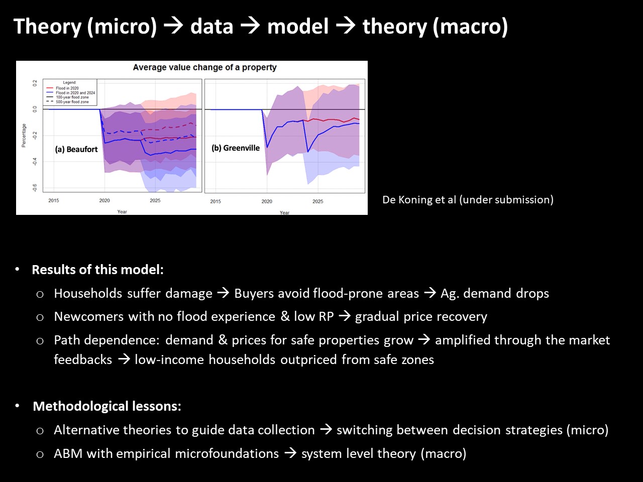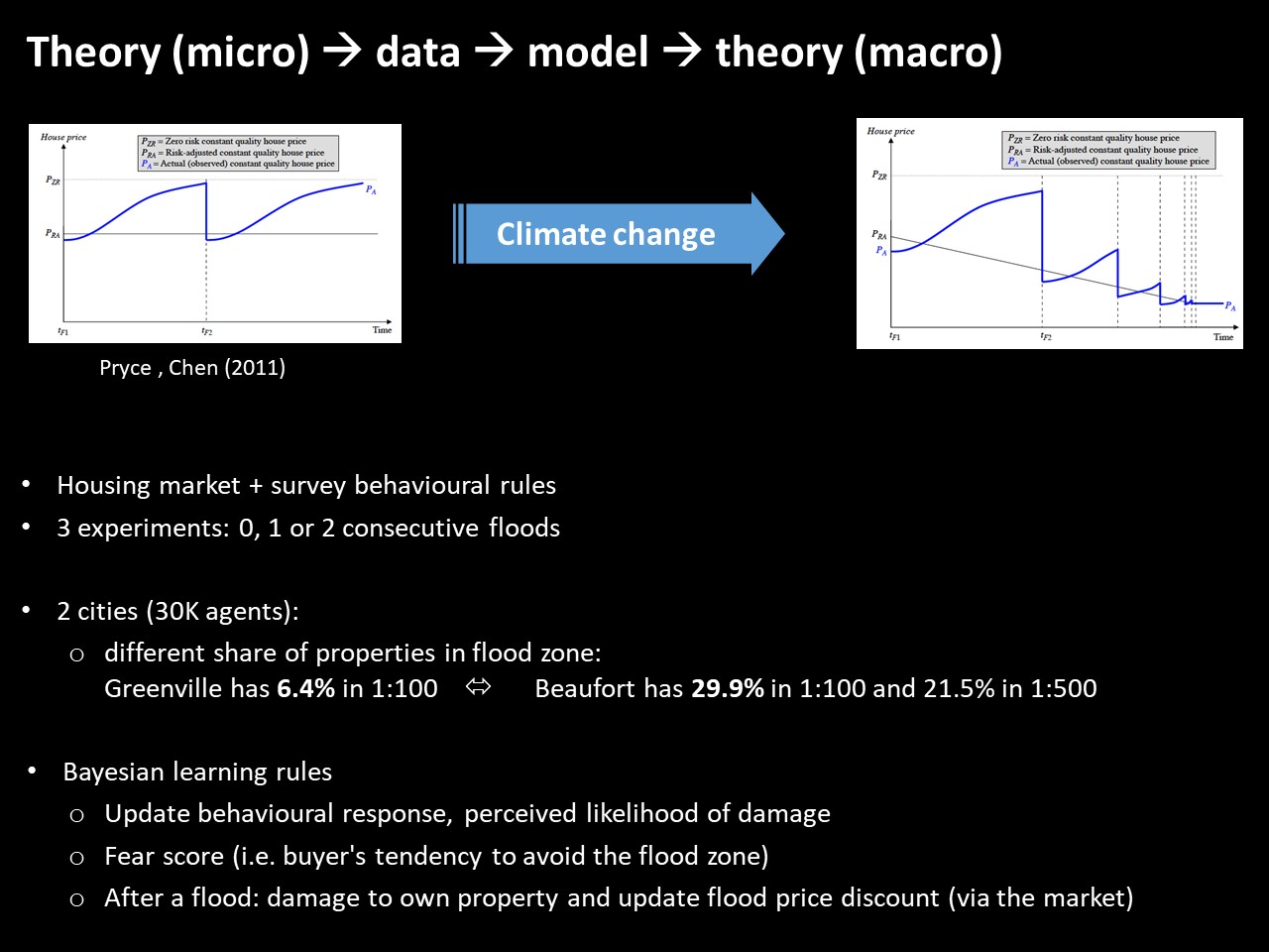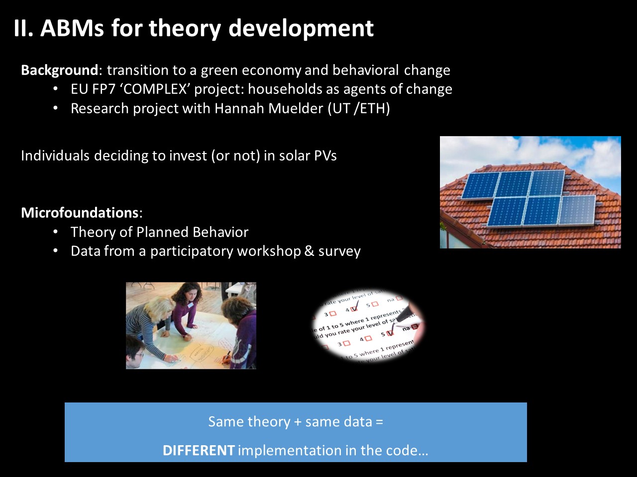 So what is the formal procedure we use to develop our Agent Based Models? We first start from the theory to isolate the cause-effect relationships and to formulate hypotheses. We then collect a set of very different data, ranging from market transactions to GIS, Lab experiments and surveys to test alternative behavioral theories and compare to observed macro data.